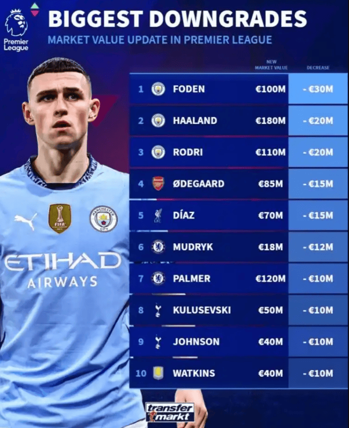 跌幅榜上,曼城球员包揽三甲,福登下跌3000万欧,哈兰德下跌2000万欧,罗德里下跌2000万欧,不过三人身价依然都在1亿欧以上。